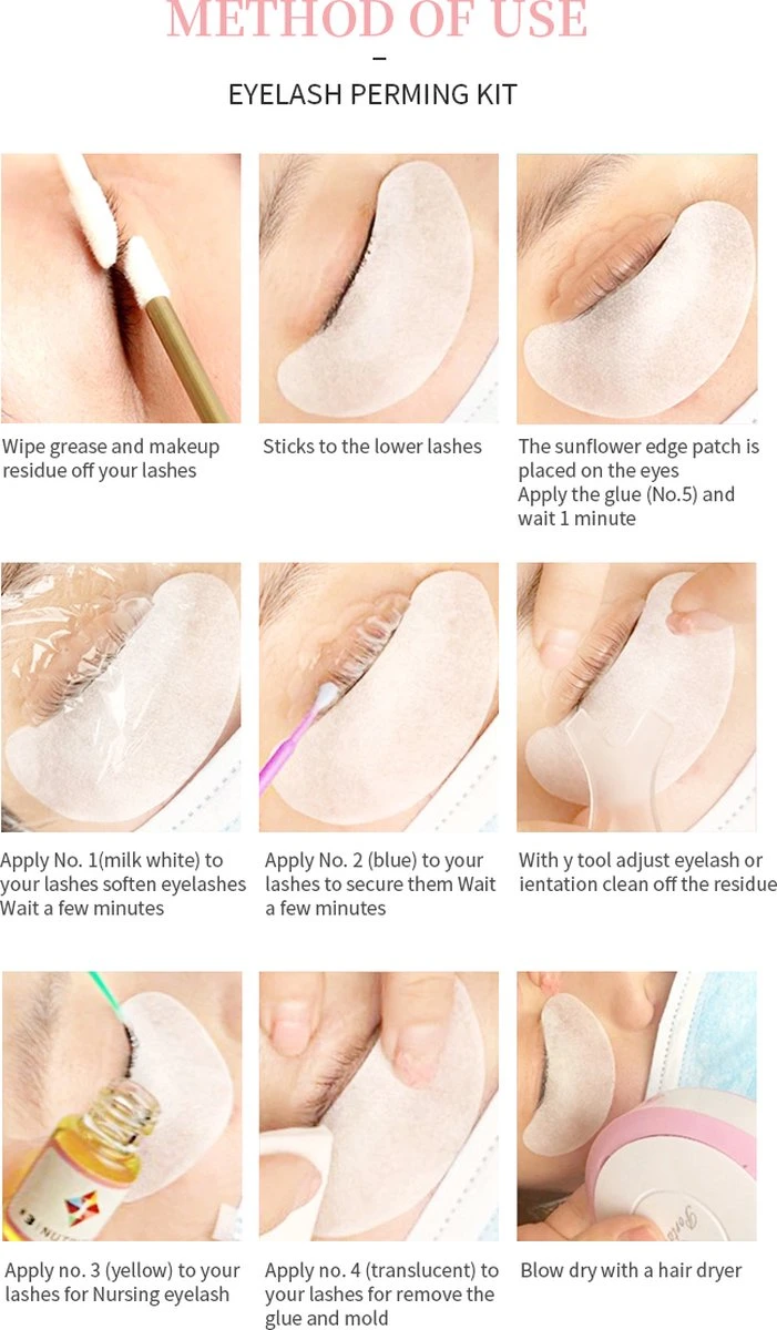 Op de achterkant van de doos staat een uitgebreide handleiding hoe je professioneel en efficiënt je eigen wimpers kunt zetten. De wimperkrullen gaan 1 hele maand lang mee zonder dat je dagelijks een wimperkruller hoeft te gebruiken. Volg de stappen hieronder voor een succesvolle wimperlift sessie.