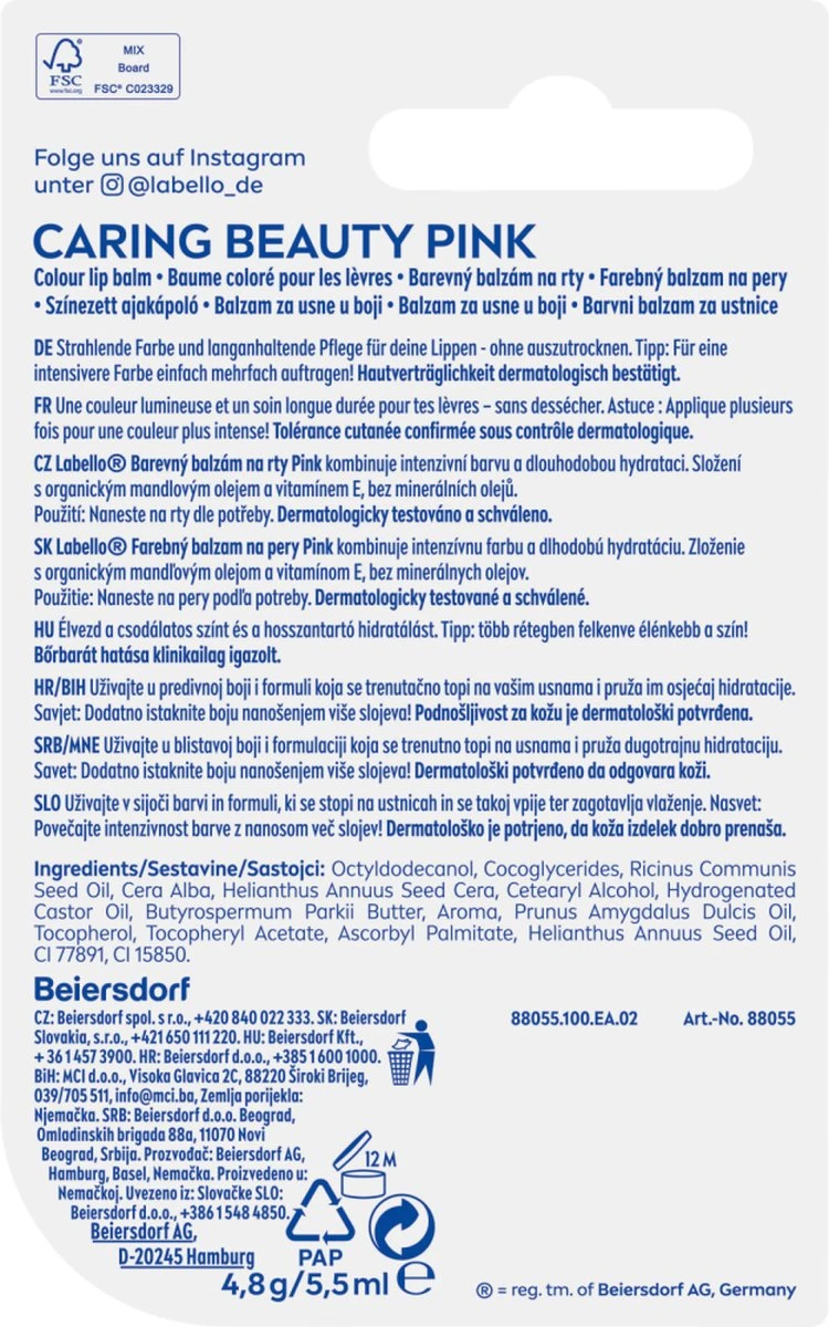 Labello Caring Beauty Pink 2-in-1 lippenbalsem combineert kleurpigmenten met de bewezen verzorgingsproducten van Labello. De minerale olievrije formule met sheaboter, biologische amandelolie, vitamine E en een licht bloemige geur is speciaal ontwikkeld voor dagelijks gebruik. Deze Labello laat een stralende finish achter zonder uit te drogen, zorgt voor een langdurige verzorging en is makkelijk egaal aan te brengen. De huidverdraagzaamheid is ook dermatologisch bevestigd.