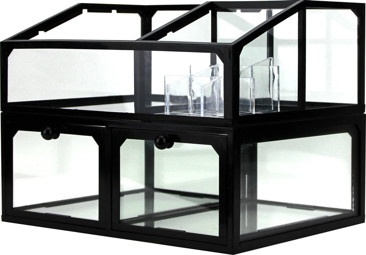 Heb je ook graag al je make-up spullen en accessoires overzichtelijk bij elkaar? Dan is deze beautybox een echte “musthave”. Deze beautybox heeft een zwart frame, het overige gedeelte is van glas en geven deze organizer een fraai en overzichtelijk uiterlijk. De beautybox heeft twee lades en aan de bovenkant bevinden zich drie vakjes, om foundation, nagellak, lippenstift of andere beautyproducten georganiseerd en overzichtelijk in op te bergen. Deze cosmetica organizer is niet alleen praktisch, maar ziet er ook nog eens geweldig uit. Je kunt het schoonmaken met een droge of vochtige doek. Het product is niet vaatwasbestendig.