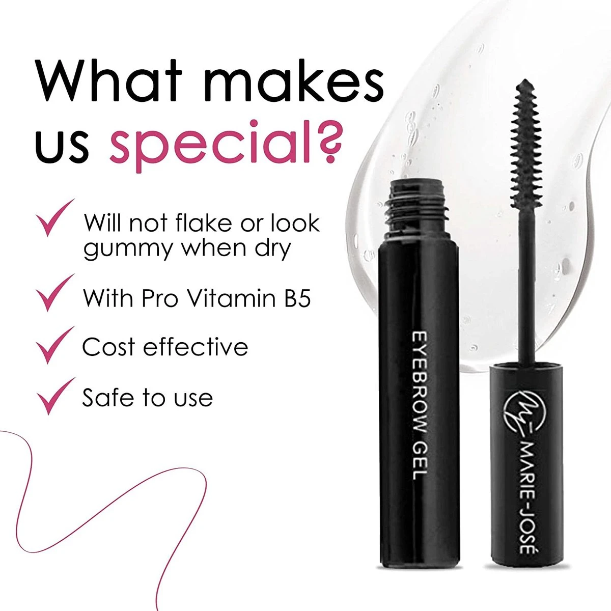 Sommige wenkbrauwhaartjes willen niet meewerken en staan altijd de verkeerde kant op! Wil dat zeggen dat je ze moet weghalen? Nee, met de sterke styling gel die speciaal is ontwikkeld voor wenkbrauwhaartjes is dat niet nodig. De wenkbrauwhaartjes blijven de hele dag netjes zitten en niemand die ziet dat je daar iets voor hebt gebruikt. De wenkbrauwgel van Marie-José & Co is namelijk niet glanzend en bevat geen alcohol. De huid rond je wenkbrauwen droogt hierdoor niet uit en gaat niet schilferen. Door de toegevoegde Pro-vitame B5 worden de haartjes ook nog eens verzorgd en zien ze er gezond uit.