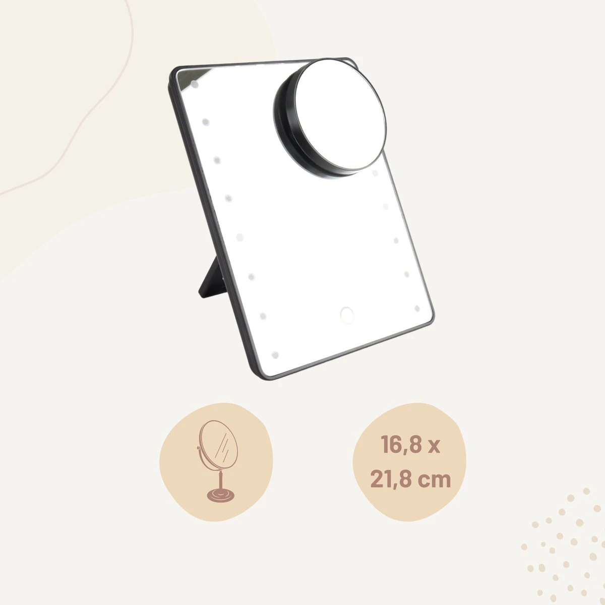 Breng je make-up perfect aan met de Orange85 Make-up Spiegel met Verlichting Zwart. Deze spiegel is voorzien van 16 LED-lichtjes waardoor je je eigen gezicht perfect kan zien. Zeer geschikt om kleine haartjes te verwijderen. De spiegel is voorzien van een klein spiegeltje die drie keer vergroot. De afmetingen zijn 21.8 x 16.8 x 0.5 cm.