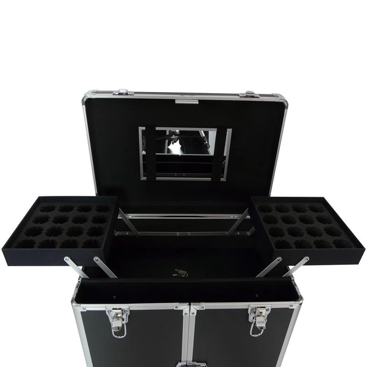 De tweede branche specifiek kenmerk van deze pedicure koffer is de aanwezigheid van de uitneembare verdeling voor de flesjes in het bovenste gedeelte van deze pedicure koffer, zoals flesjes van de nagellak / topcoat / nagellijm / Primer enz. Ook deze cosmetische producten worden perfect beschermd tijdens het vervoer. Verder zijn er nog andere opbergmogelijkheden aanwezig, zoals de grote bovenvak en de mogelijkheid om het klein materiaal in de openstaande deuren van deze pedicure koffer op te bergen. Niet te vergeten is de multifunctionele uitneembare spiegel, dat bovendien ook staand kan worden ingezet.